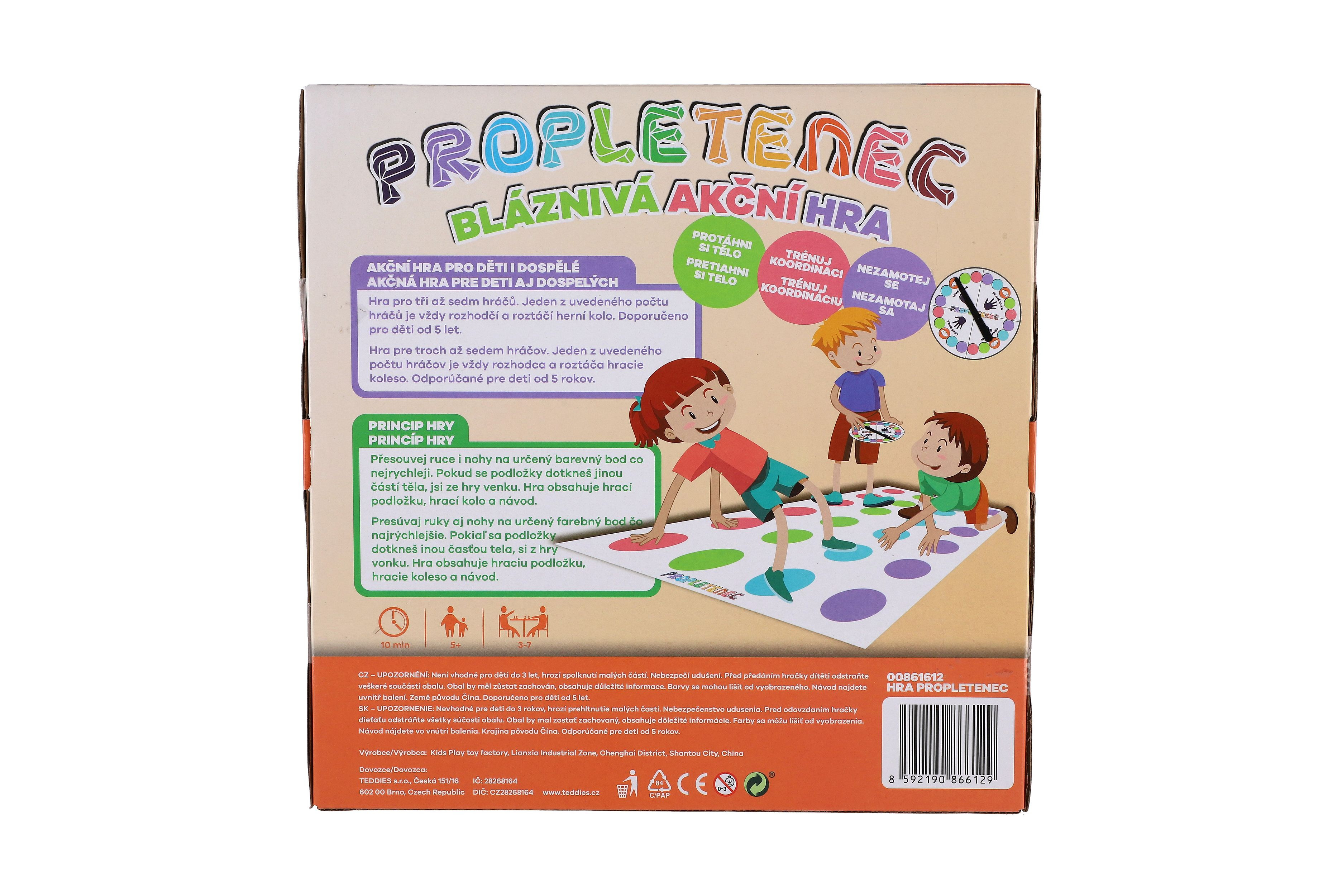 Bláznivá akční hra, která velice vtipným způsobem trénuje koordinaci těla. Kdo se nejdéle udrží na nohou, nebo snad na rukou? Přesouvej ruce i nohy na určený barevný bod co nejrychleji. Pokud se podložky dotkneš jinou částí těla, jsi ze hry venku. Obsahuje hrací podložku velikosti 117 x 160 cm, hrací kolo a návod. Hra je určena pro 3 až 7 hráčů. Rozměry balení 28 x 27 x 6 cm. Vhodné pro děti od 5 let.