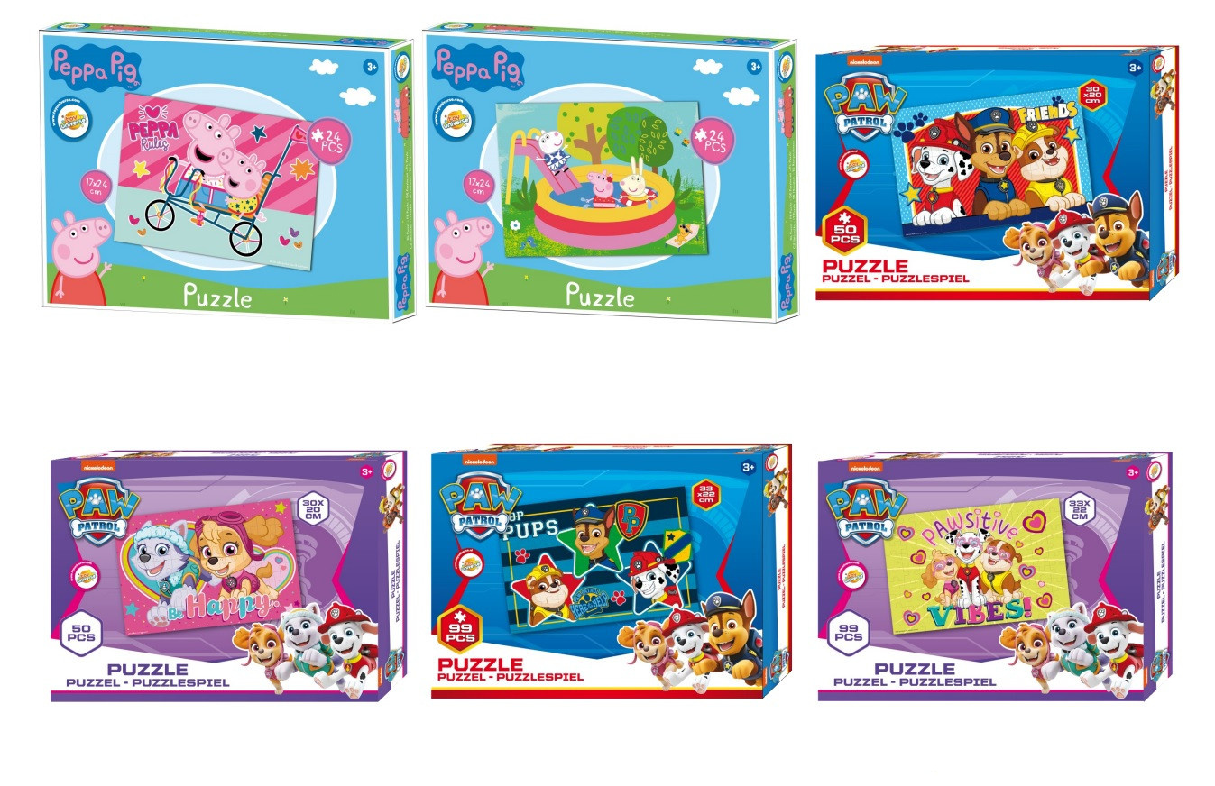 Puzzle 24, 50 a 99 dílků 25x18,5x3 cm 6 druhů (Paw Patrol, Peppa Pig). Nelze vybrat druh, dodáváme dle skladové dostupnosti.