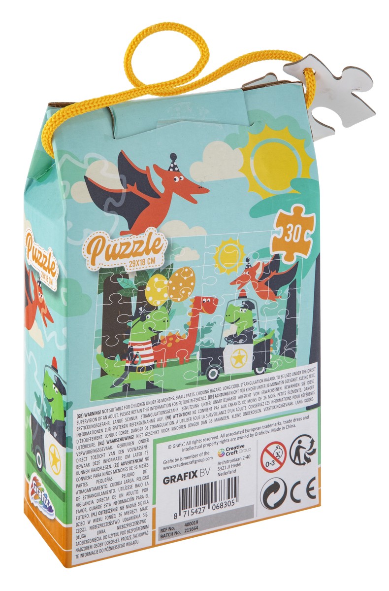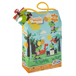 Nádherné dětské puzzle obsahující 30 velkých dílků, které po složení vytvoří obrázek s motivem dinosaurů o rozměru 29x18 cm, baleno v krásné dárkové krabičce s uchem