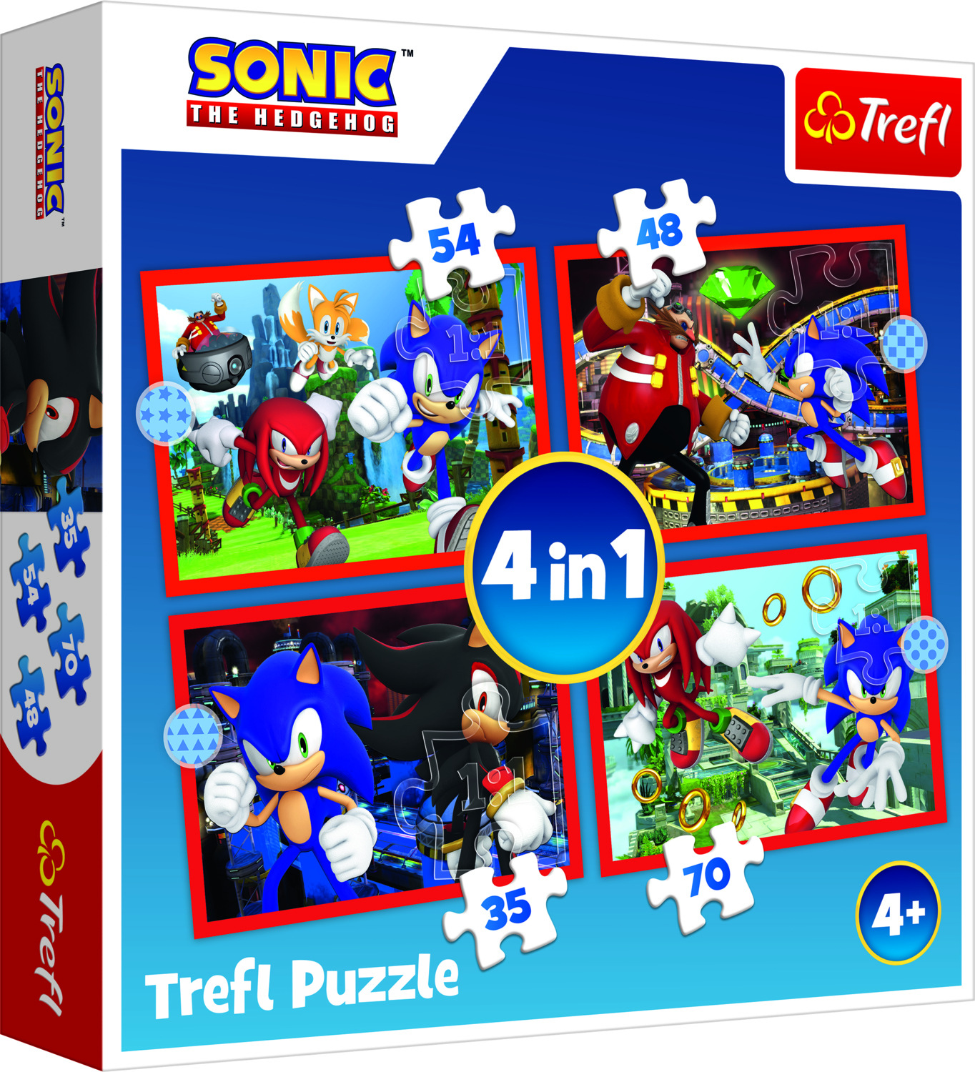 Poskládejte si puzzle s motivem animovaného Sonica. Puzzle 4v1 obsahuje 54, 48, 35 a 70 dílků, které rozvíjí dětské schopnosti a cvičí šikovnost. Rozměry balení 28 x 28 x 6 cm. Vhodné pro děti od 4 let.