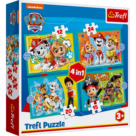 Puzzle s motivem oblíbeného seriálu Tlapková patrola. Čtyři samostatná puzzle s různým počtem dílků - 12, 15, 20 a 24 - postupně vedou ke zdokonalování dítěte při skládání a zvyšování obtížnosti. Rozměry balení 28 x 28 x 6 cm. Vhodné pro děti od 3 let.