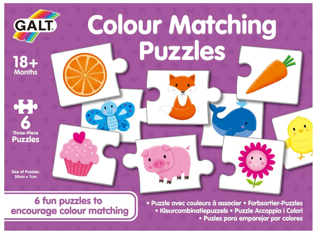 Sada šesti barevných tematických puzzle pro velmi malé děti. Každé puzzle se skládá ze tří dílků a pomůže při nácviku poznávání barev známých předmětů a zvířátek a při rozvoji dovedností, jako je párování a třídění. Ideální první puzzle obsahující méně dílků, které se rychle skládá.