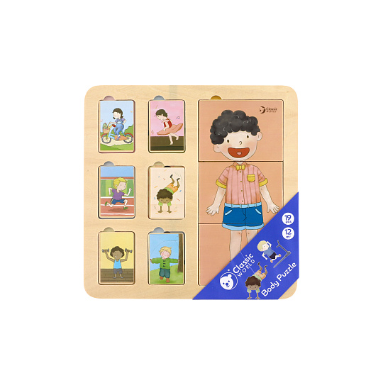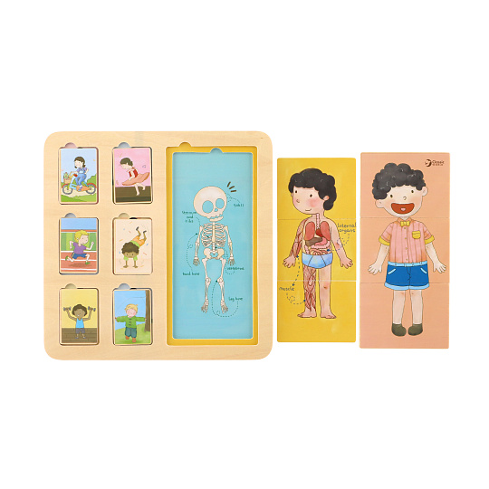 Puzzle lidské tělo má tři vrstvy. Zobrazuje strukturu těla ze svalů, orgánů a kostí. Děti mají možnost prozkoumat lidské tělo. Puzzle obsahuje 19 dřevěných dílů (včetně podložky). Rozměr podložky: 30 x 30 cm Vhodné pro děti od 12 měsíců