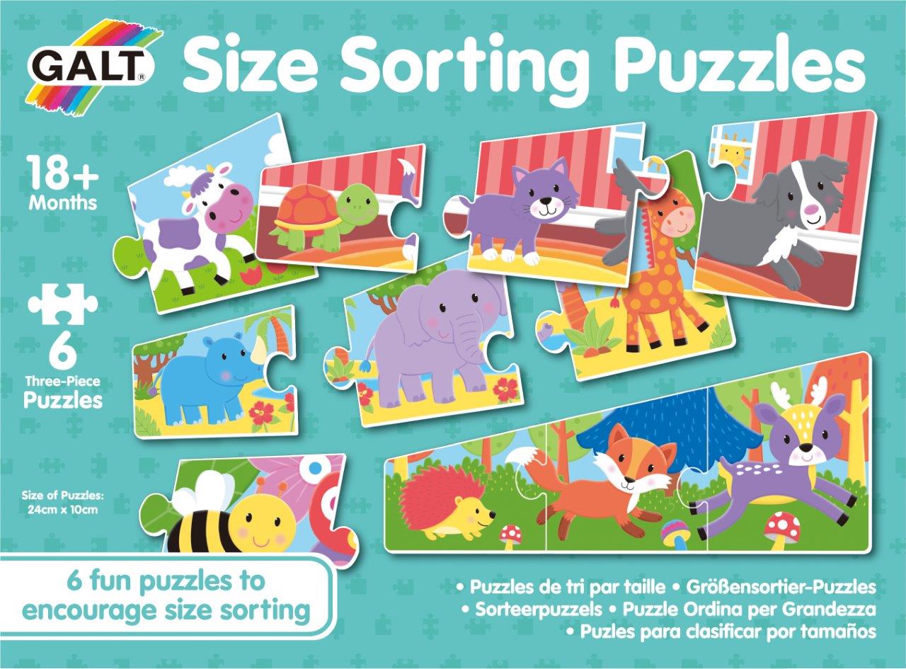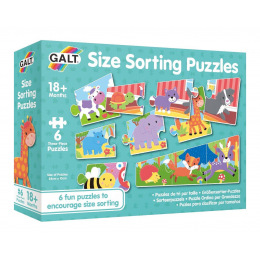 Sada šesti puzzle s legračními postavičkami zvířátek pro velmi malé děti. Každé puzzle se skládá ze tří dílků a pomůže při rozvíjení rozeznávání velikosti, protože zvířátka jsou seřazena podle velikosti. Ideální první puzzle obsahující méně dílků, které se rychle skládá.