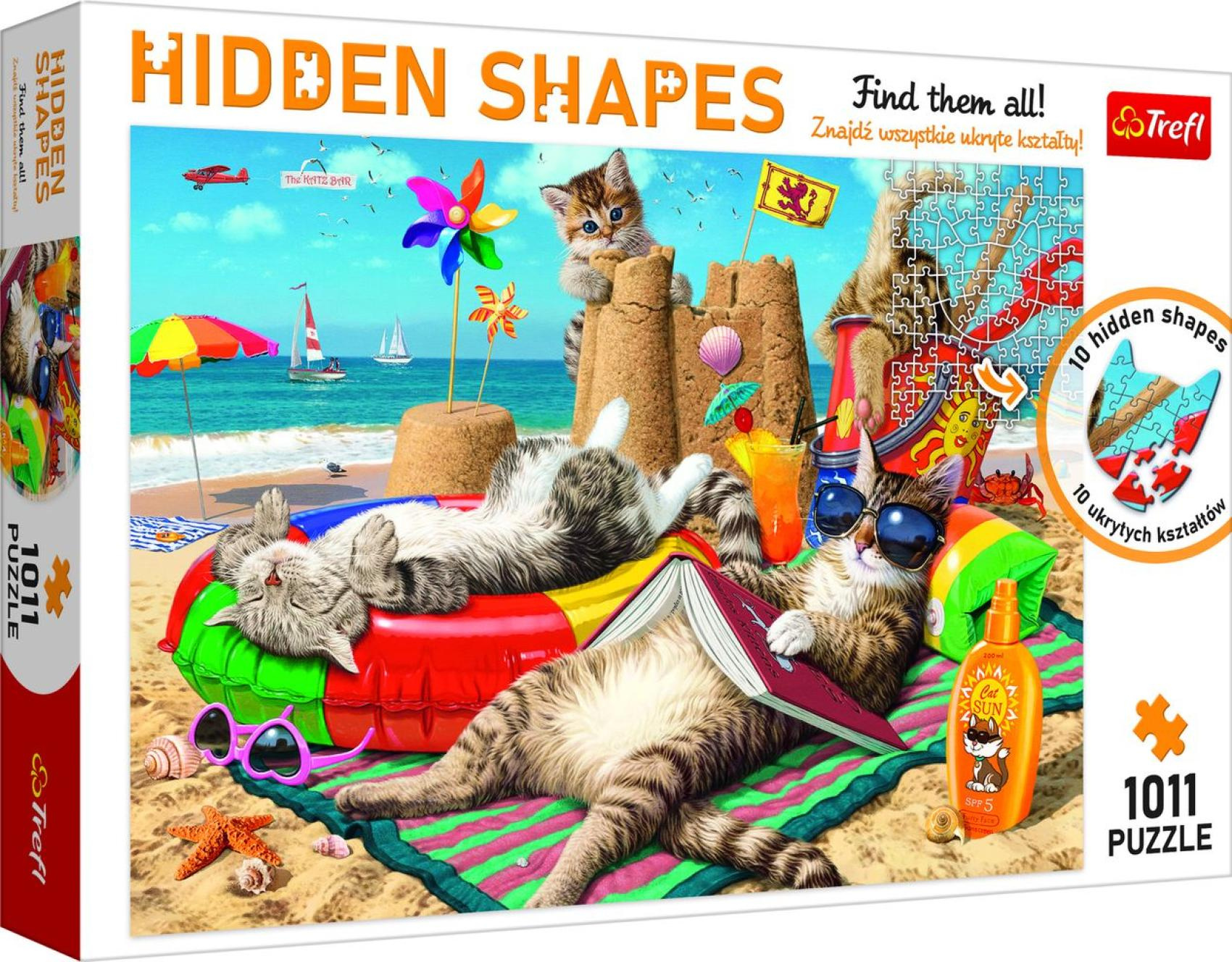 Puzzle Kočky na pláži - Skryté tvary 1011 dílků 68x48cm v krabici 40x27x6cm