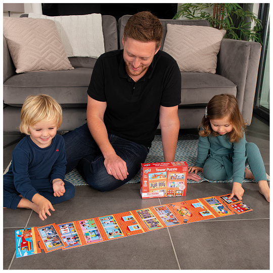 Kreativní puzzle požární stanice skládané do tvaru věže.