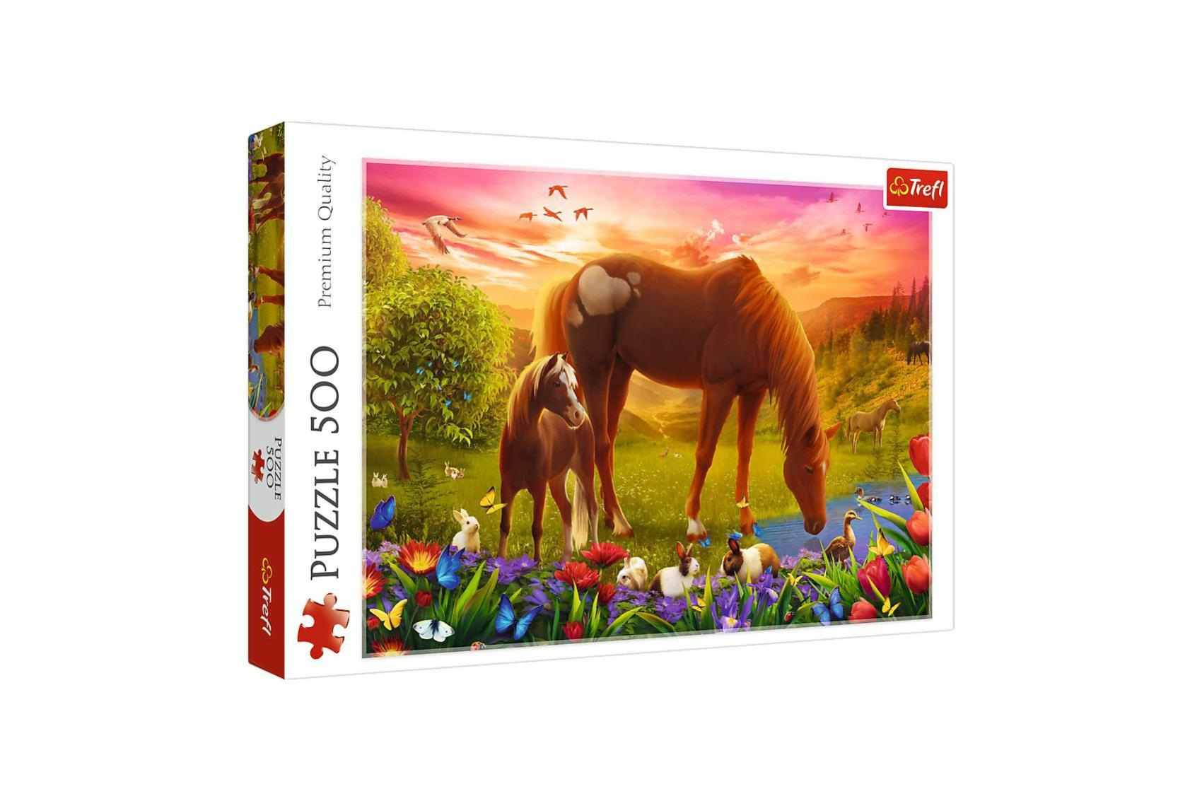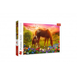Puzzle s 500 dílky zobrazující rodinu koní. Po sestavení vytvoříte obrázek o rozměrech 48 x 34 cm. Kvalitu, sytost barev a bezpečnost zajišťuje kalandrovaný papír potažený ekologickými barvami. Rozměry balení 40 x 26,5 x 5 cm Vhodné pro děti od 10 let