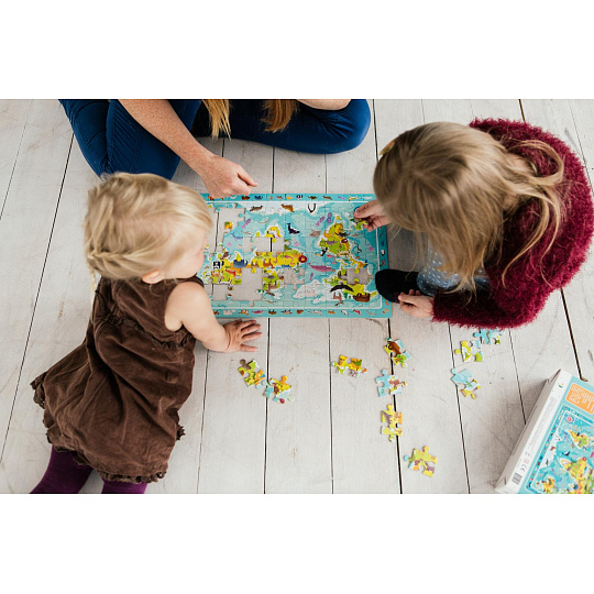 Vzdělávací puzzle, které obsahují barevné obrázky různých zvířátek, které žijí po celém světě. Po dokončení puzzlí mohou děti hrát hru „Najít a hledat“, kde určují umístění zvířat na mapě světa. Puzzle navržené tak, aby bylo zábavné i vzdělávací, s barevnými vzory, které napomáhají rozvoji dítěte. Velikost složeného obrázku: 45 x 31 cm Rozměr balení: 25 x 16 x 6,5 cm Vhodné pro děti od 5 let