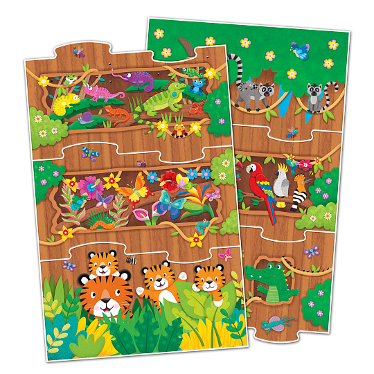 Děti mohou začít s dolním dílkem a připojit 10 dalších dílků v libovolném pořadí, následovaných vrchním dílkem a vytvořit si tak svou džungly pokaždé jinou.