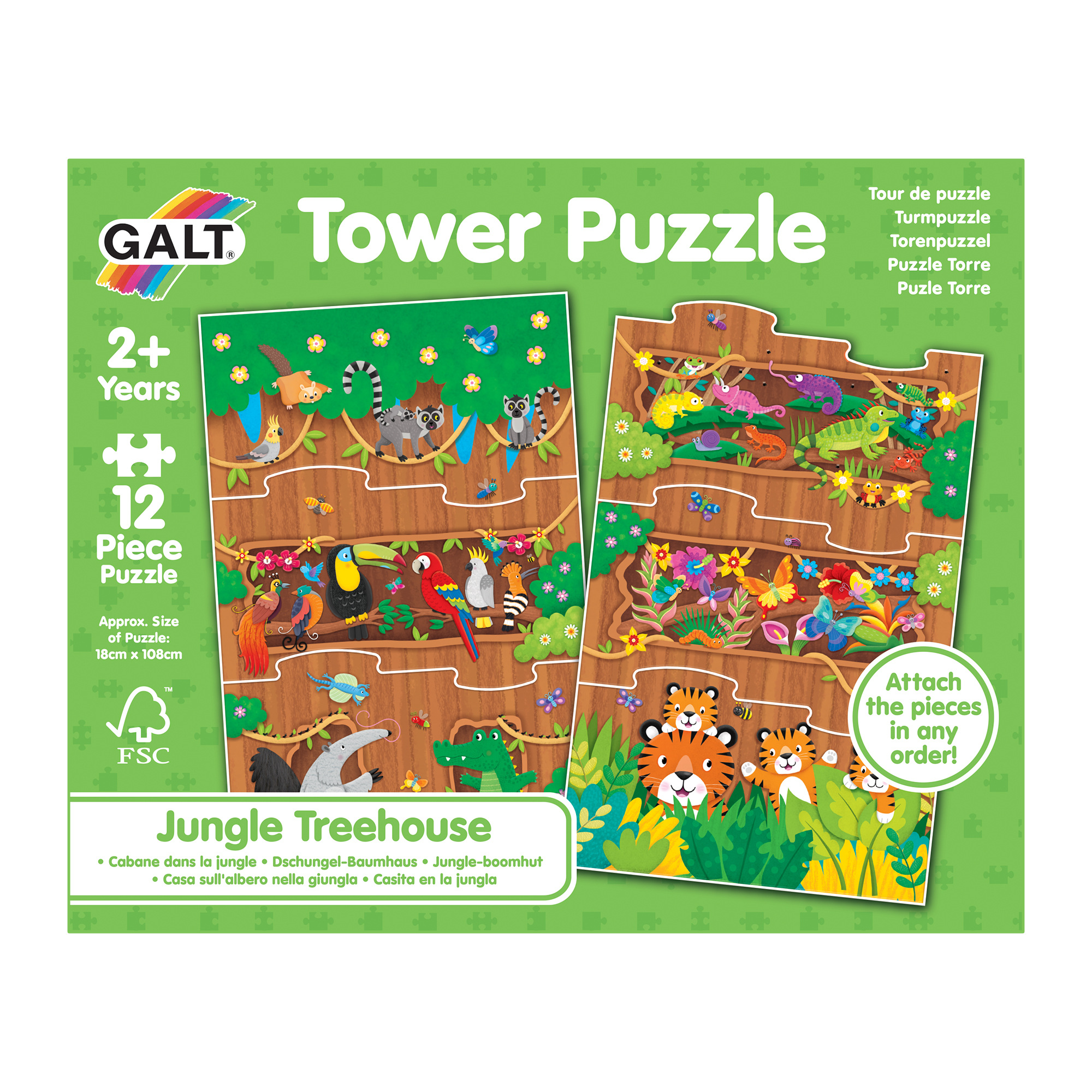 Děti mohou začít s dolním dílkem a připojit 10 dalších dílků v libovolném pořadí, následovaných vrchním dílkem a vytvořit si tak svou džungly pokaždé jinou.