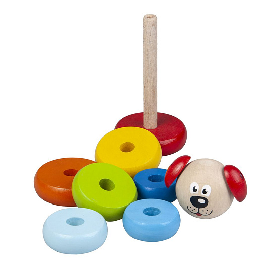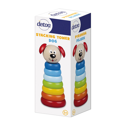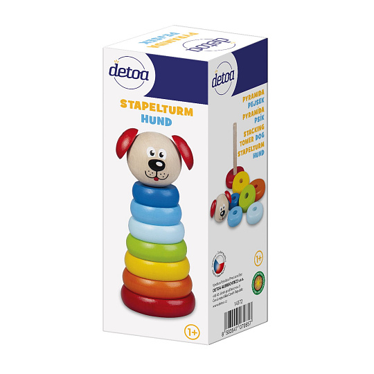 Dřevěná skládací pyramida s motivem méďi, rozvijí představivost, logické myšlení a motorické schopnosti dítěte.Výrobek splňuje požadavky EU na bezpečnost hraček a je vhodný pro děti od 1 roku.Rozměry výrobku jsou 140 x 55 mm.