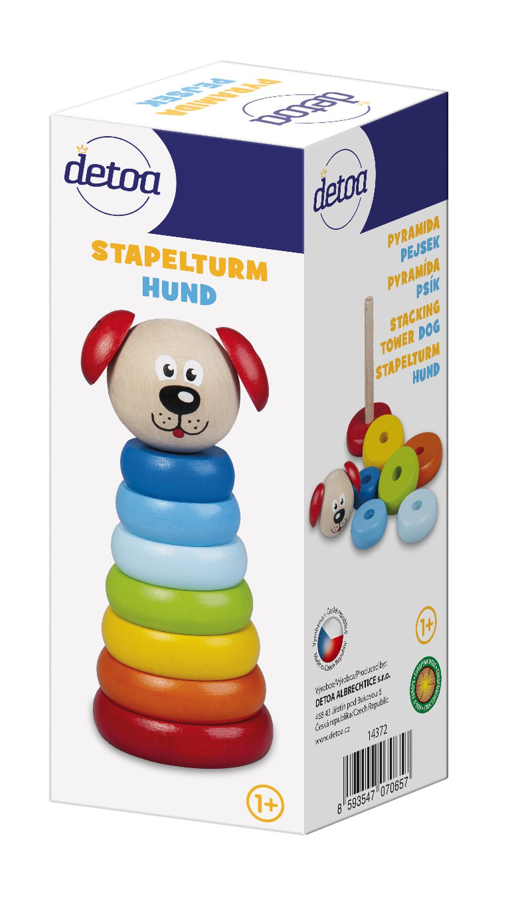 Dřevěná skládací pyramida s motivem méďi, rozvijí představivost, logické myšlení a motorické schopnosti dítěte.Výrobek splňuje požadavky EU na bezpečnost hraček a je vhodný pro děti od 1 roku.Rozměry výrobku jsou 140 x 55 mm.