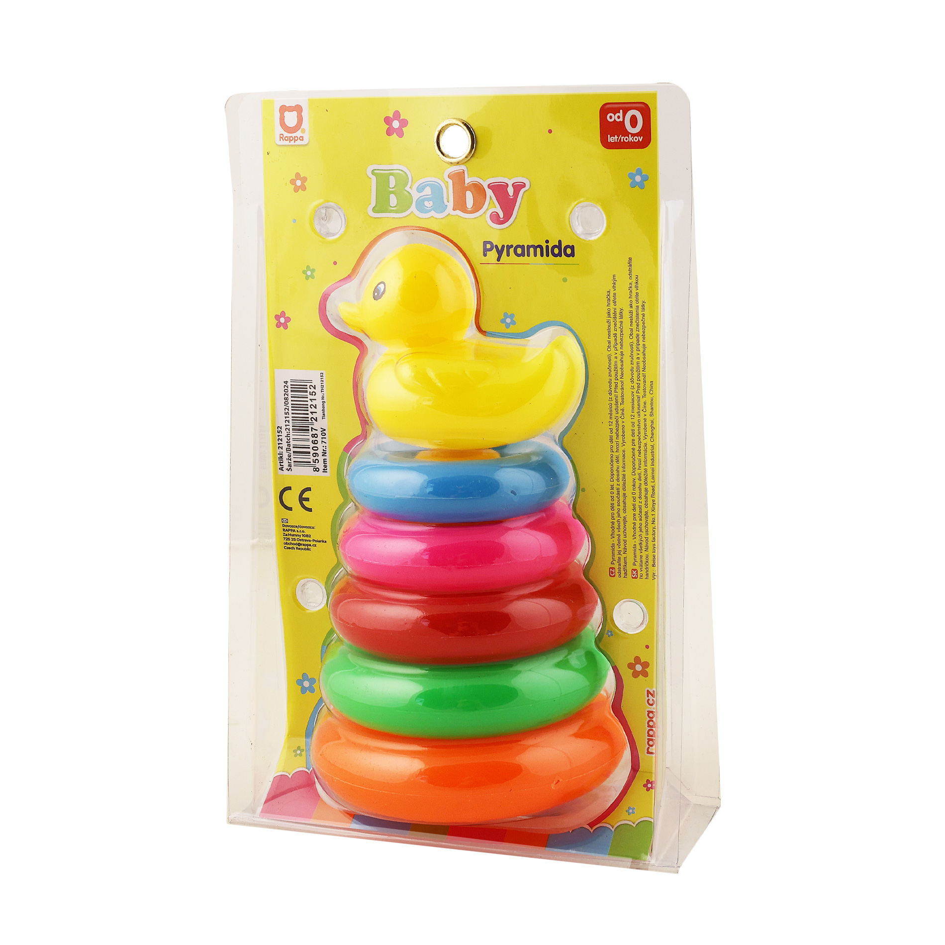 Pestrobarevná pyramida s kačenkou je perfektní hračkou pro ty nejmenší. Pět různě barevných kroužků se na sebe skládají. Rozvíjí vizuální stimulaci, motorické dovednosti a koordinaci rukou. Vhodné pro děti od 0 let, doporučeno pro děti od 12 měsíců (z důvodu zručnosti).