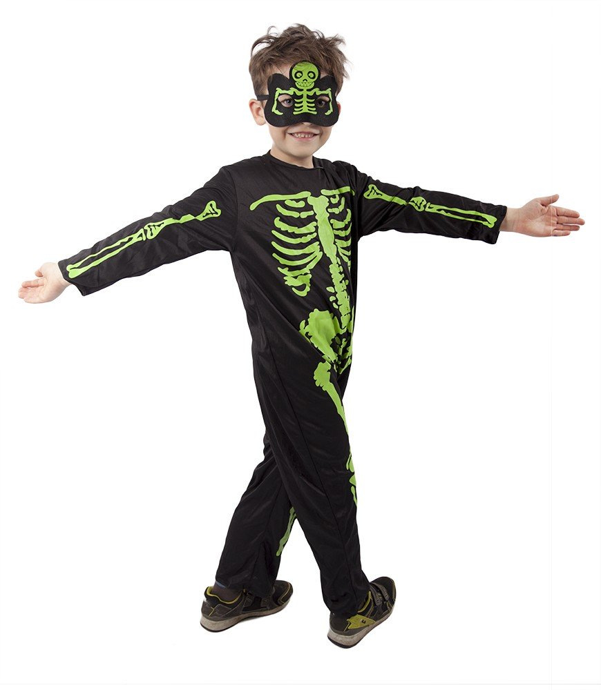 Strašidelný karnevalový kostým s motivem kostlivce! Kostým ve velikosti M je určen pro chlapečky ve věkovém rozmezí 6-8 let. Balení obsahuje černou kombinézu a masku s motivem zeleného kostlivce.