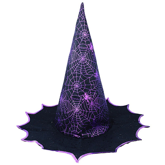 Karnevalový halloweenský klobouk zdobený magickými pavučinami a flitry. Je určen pro dospělé. Výška klobouku cca 39 cm.