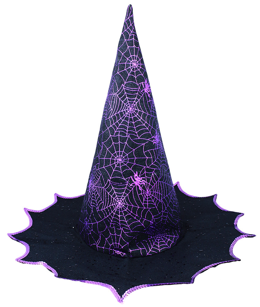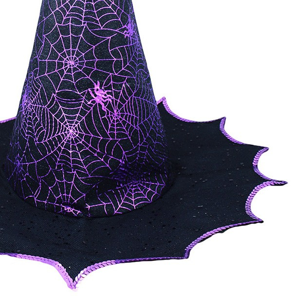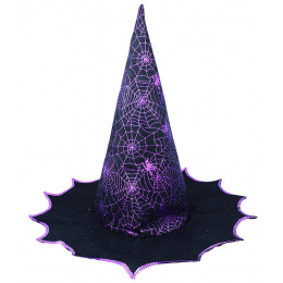 Karnevalový halloweenský klobouk zdobený magickými pavučinami a flitry. Je určen pro dospělé. Výška klobouku cca 39 cm.