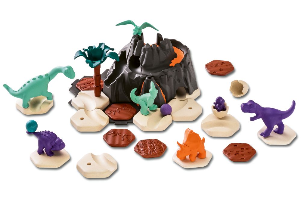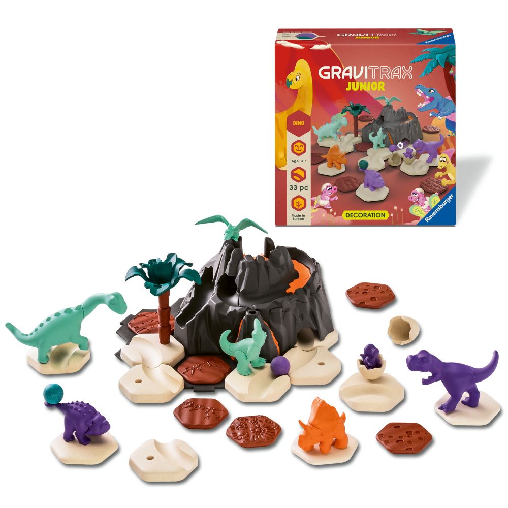 GraviTrax Junior je interaktivní systém kuličkové dráhy pro děti od 3 let. Ti nejmenší si staví své vlastní světy z kuličkových drah, které lze podle libosti zdobit a vytvářet tak jednotlivé tematické světy. Děti si tak při kreativním stavění užijí mnoho zábavy. Ve spojení se startovací sadou se děti od 3 let mohou okamžitě ponořit do světa dinosaurů. Různorodé dinosauří figurky, působivá sopka a další tematické prvky poskytují nekonečné možnosti stavění a hraní. Všechny součásti jsou vyrobeny z dřevěného bioplastu.