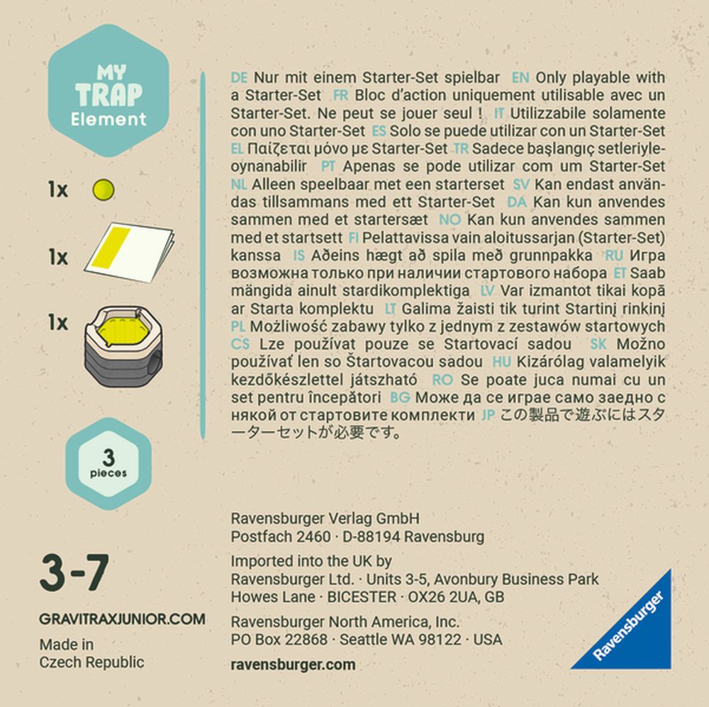 GraviTrax Junior je interaktivní systém kuličkové dráhy pro děti od 3 let. Ti nejmenší si staví své vlastní světy z kuličkových drah, které lze podle libosti zdobit a vytvářet tak jednotlivé tematické světy. Děti si tak při kreativním stavění užijí mnoho zábavy. Chlapci a dívky si mohou stavět své vlastní světy z kuličkových drah, které lze dle libosti zdobit a vytvářet tak jednotlivé tematické světy. Stejně jako všechny ostatní součásti systému interaktivní kuličkové dráhy je doplněk Past vyroben z dřevěného bioplastu. Doplněk Past vytváří v dráze magický efekt, protože kuličku spolkne a ta je vypuštěna v nižším patře. Tímto způsobem můžete postavit ještě napínavější dráhy – pro nikdy nekončící zábavu.