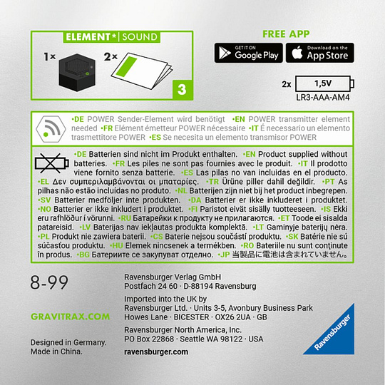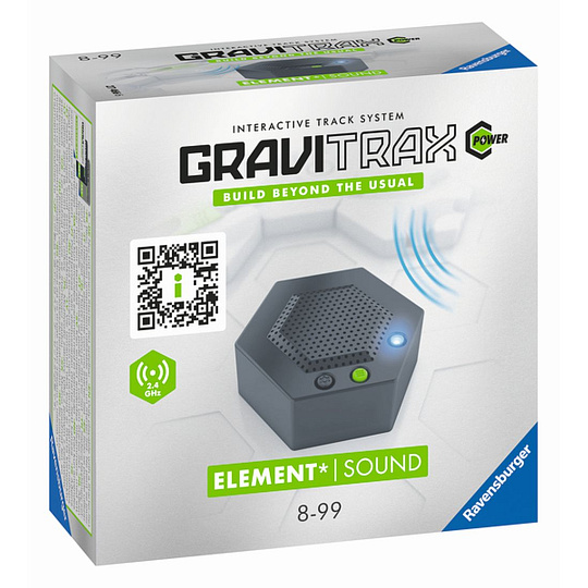 Se Zvukovým prvkem řady GraviTrax POWER lze do jakékoli dráhy GraviTrax integrovat skvělé zvukové efekty. Mezi všemi prvky GraviTrax POWER existují neviditelná spojení. Po přijetí signálu se spustí akční zvuk. Je možné přepínat mezi různými zvukovými světy. Kromě toho lze stisknutím tlačítka zvolit atmosférickou hudbu na pozadí. Budete potřebovat vysílací prvky GraviTrax POWER (nejsou součástí sady).