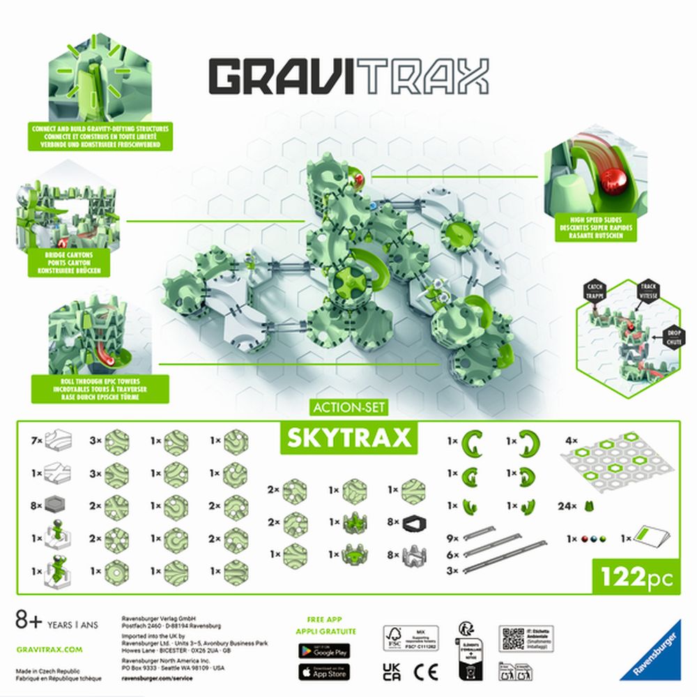 Startovní sada Skytrax M otevírá nové možnosti stavění díky vzrušujícím funkcím a přináší jedinečnou zábavu při budování kuličkových drah. Inovativní kameny Skytrax umožňují kuličkám propadat, zachytávat je a propojovat jednotlivé prvky do podoby mostů. Speciální klouzavky pak roztočí kuličky kolem majestátních věží ve vysoké rychlosti. Fantazii se meze nekladou – ideální pro všechny dobrodruhy, kteří touží po dráze plné triků a nekonečných možností. Sada Skytrax M obsahuje více než 120 různorodých prvků. Přiložené stavební plány ukázkových drah usnadňují začátky se systémem kuličkové dráhy. Zážitek zpestří akční prvek lopata – přidává do dráhy dynamiku a napínavou akci, která zaručeně zaujme.