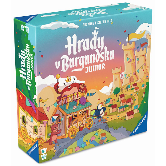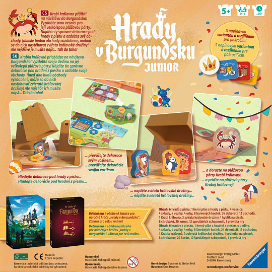 Krabí královna přijíždí do města a potřebuje pomoc s výzdobou své královské plážové party! V dětské verzi oblíbené hry Hrady v Burgundsku si děti od 5 let zahrají napínavou paměťovou hru, kde se pomocí kostek snaží najít správné dekorace, převézt je do své vesnice a získat co nejvíce bodů. Když nasbírají dvě dekorace stejné barvy, mohou se pokusit najít i zvířecího pomocníka královny – ale jen pokud si zapamatují, pod kterým pískovým hradem se skrývá. Hra rozvíjí paměť, taktiku a přináší spoustu zábavy v krásně ilustrovaném světě Burgundska – ať už hrajete ve dvou, nebo ve čtyřech.