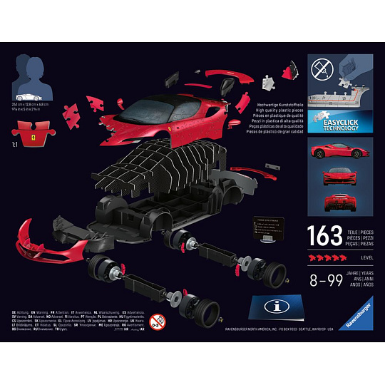 Zažijte jedinečnou kombinaci skládání a stavění a vytvořte si působivý model jednoho z nejikoničtějších vozů Ferrari SF 90 Stradale v nepřehlédnutelné červené barvě ze 108 dílků. Kvalitní, plastové puzzle s technologií Easyclick. Bez nutnosti lepení! S funkčními otáčecími koly. Puzzle obsahuje pevnou vnitřní konstrukci pro zajištění maximální stability složeného modelu.