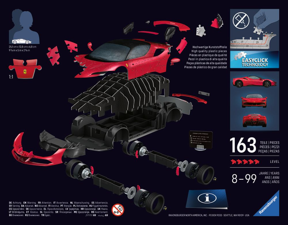 Zažijte jedinečnou kombinaci skládání a stavění a vytvořte si působivý model jednoho z nejikoničtějších vozů Ferrari SF 90 Stradale v nepřehlédnutelné červené barvě ze 108 dílků. Kvalitní, plastové puzzle s technologií Easyclick. Bez nutnosti lepení! S funkčními otáčecími koly. Puzzle obsahuje pevnou vnitřní konstrukci pro zajištění maximální stability složeného modelu.
