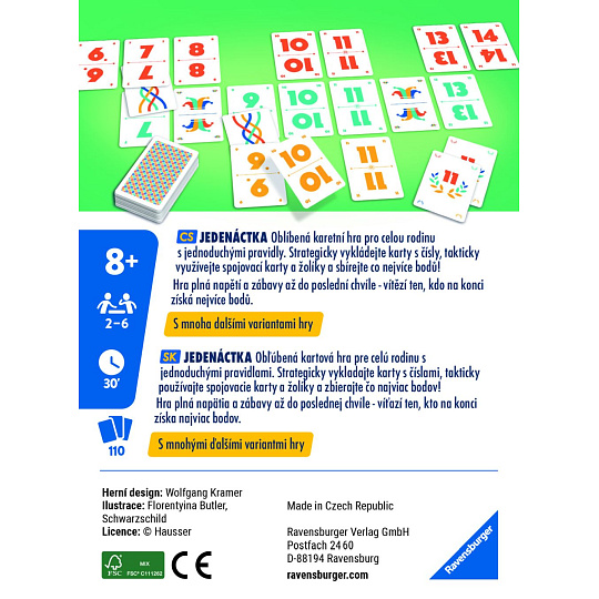 Poznejte 11! – klasickou karetní hru, která baví generace hráčů už od roku 1925! Tato hra přináší rychlou zábavu, jednoduchá pravidla a napětí až do poslední karty. Kombinujte karty strategicky, překazte plány soupeřům a chytrým tahem ukončete hru v ten pravý moment! Ideální volba pro rodinné večery i přátelské souboje, ve kterých se u stolu nikdo nebude nudit. 11! – léty ověřená klasika, která přináší radost všem věkovým kategoriím.