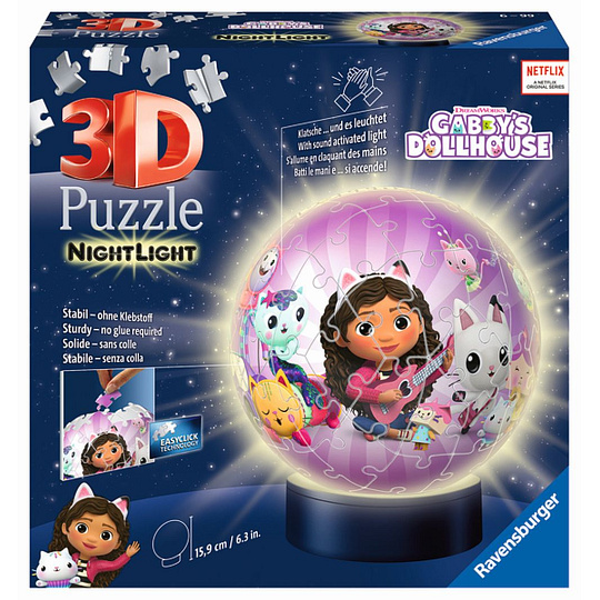 Postavte si svůj svítící 3D puzzle-ball z noční edice s motivem Gabby's Dollhouse z plastových dílků technologie EasyClick.