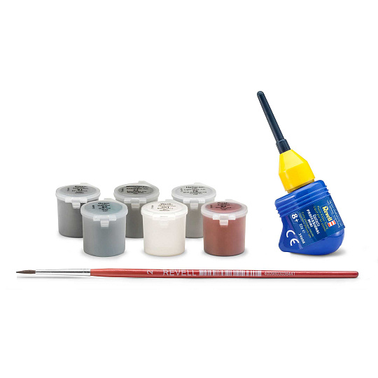 2 plastové modely (nesestavené), ilustrovaný vícejazyčný návod na sestavení, obtisky, barvy (Revell Aqua Color), štětce, lepidlo (Revell Contacta Professional Mini)
