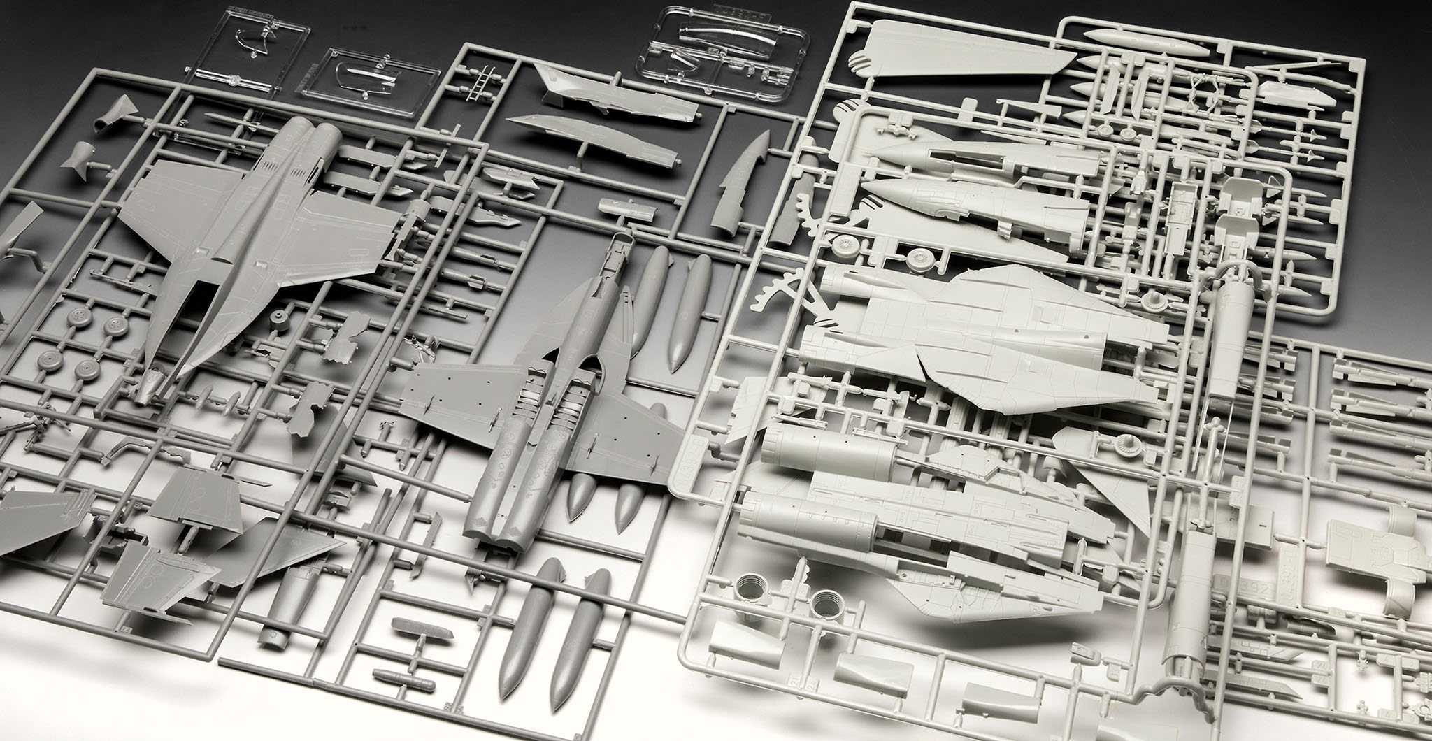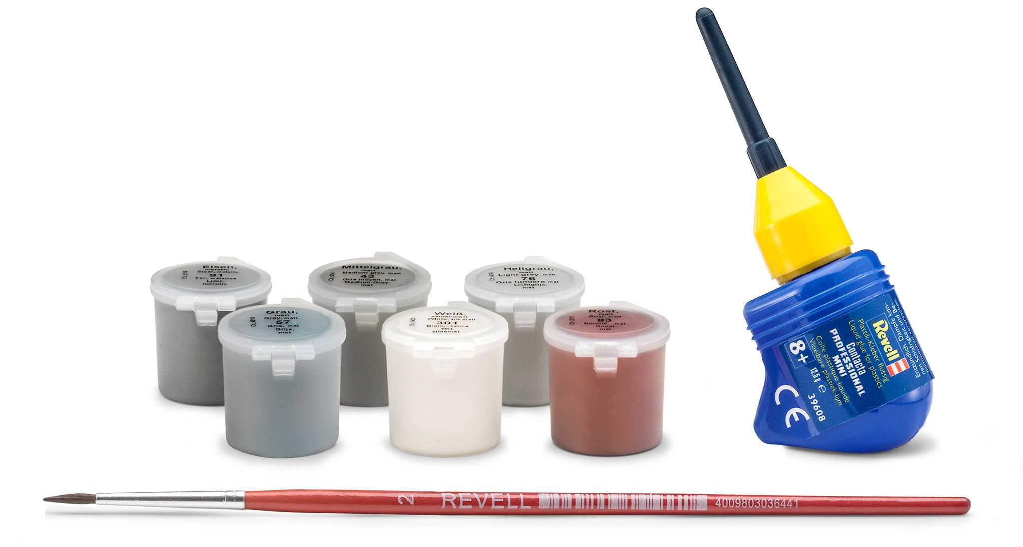 2 plastové modely (nesestavené), ilustrovaný vícejazyčný návod na sestavení, obtisky, barvy (Revell Aqua Color), štětce, lepidlo (Revell Contacta Professional Mini)