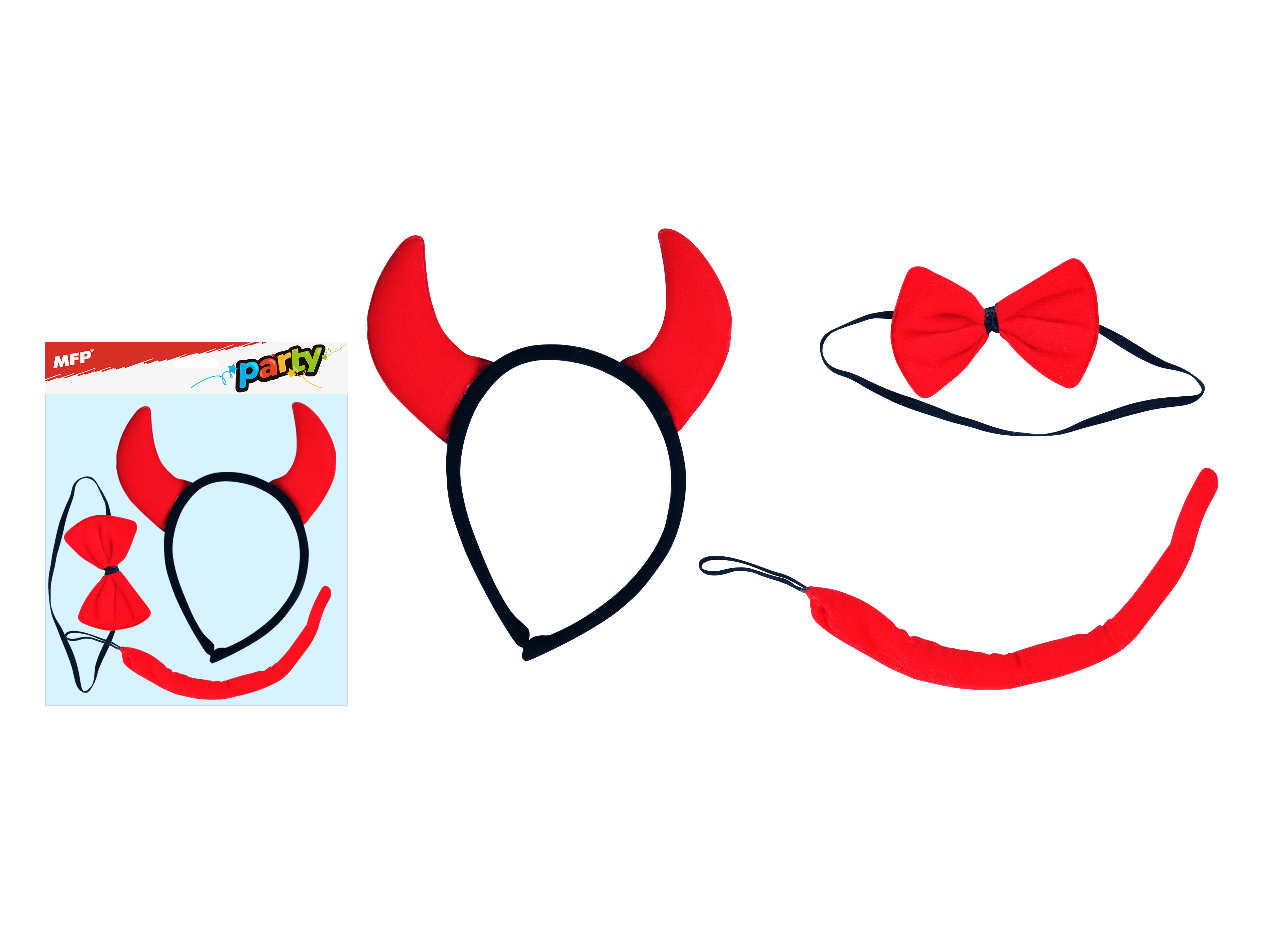 Dětská karnevalová maska - set 3 ks - ďáblík. S touto maskou bude Vaše dítě na karnevalovém plese jen zářit. Čelenka je pevná a dobře drží na hlavě. Součástí ocásku a motýlku je i natahovací gumička, která pevně drží. SET OBSAHUJE: - 1 x čelenku s ušima - 1 x motýlka - 1 x ocásek