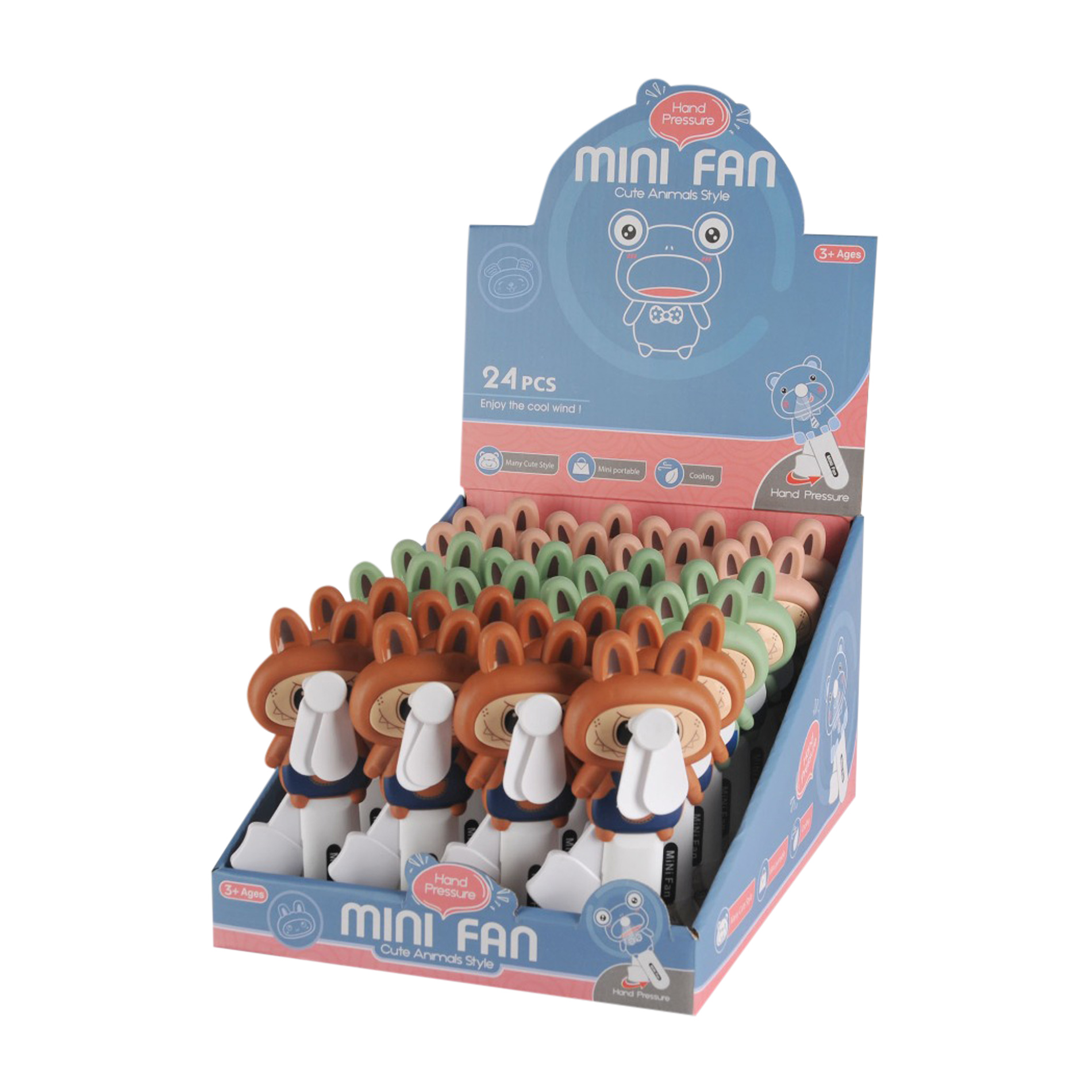 Zábavný ruční větráček/ventilátor z plastu nejen pro děti. Vrtulka se roztočí mačkáním páčky. Jednoduchý a účinný způsob jak zchladit sebe nebo své kamarády v horkých letních dnech. Mechanický pohon - na setrvačník.
