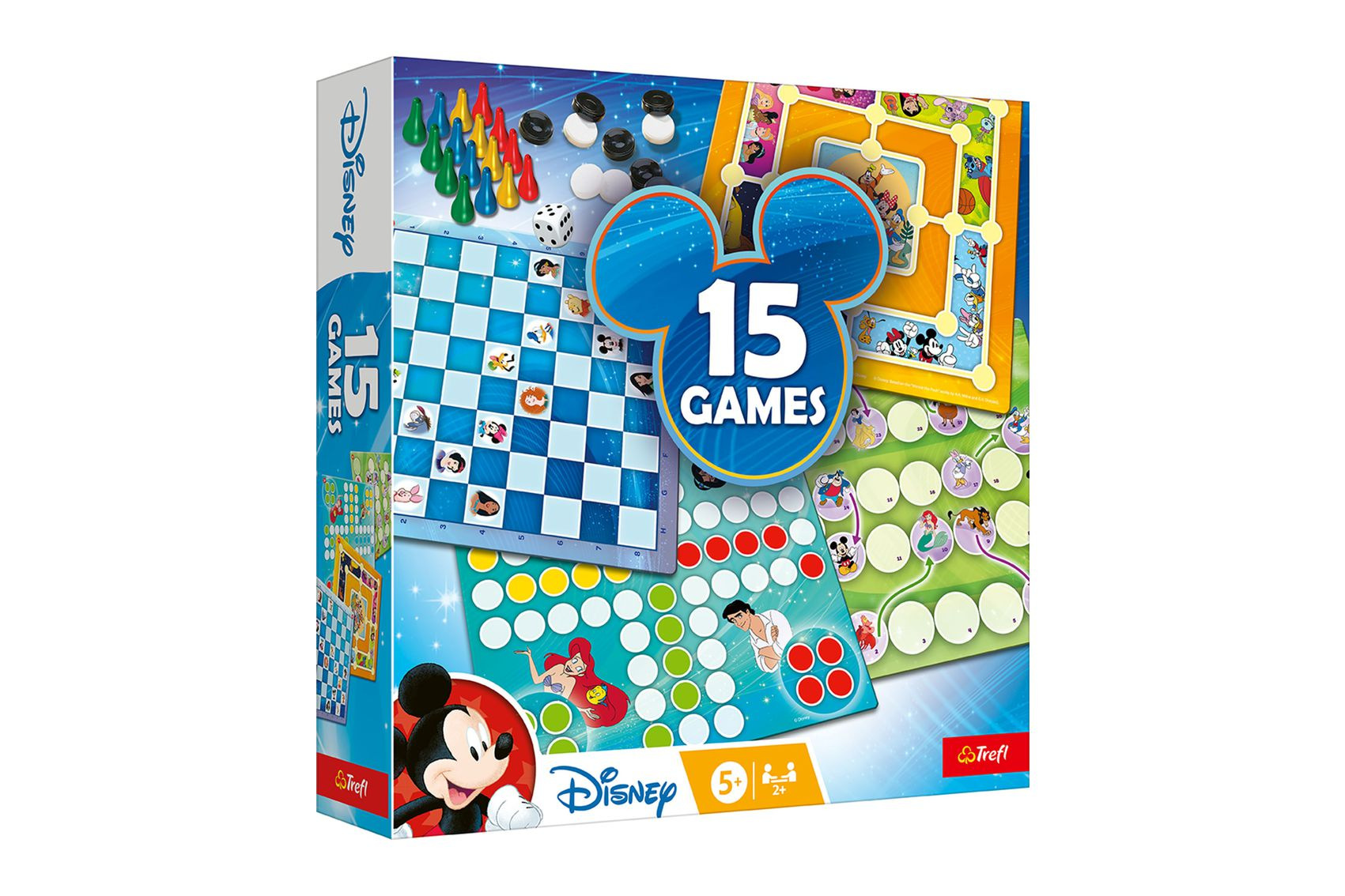 Set klasických her pro celou rodinu s oblíbenými pohádkovými postavami Disney. Sada obsahuje tradiční hry: Člověče, nezlob se!, Mlýn Hadi a žebříky, Dámu a další hry známe po celém světě. Obsah balení: oboustranné herní plány, 1 kostka, 24 kamenů, 16 barevných hracích figurek, pravidla. Pro 2 - 4 hráče. Rozměry balení: 24 x 24 x 6 cm. Vhodné pro děti od 5 let.
