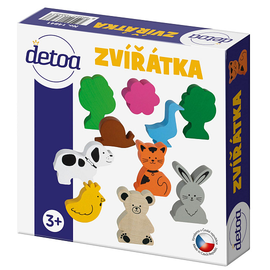 Sada obsbahuje 10ks dřevěných profilových tvarů zvířátek v různých velikostech. Některá jsou ponechána v přírodním vzhledu, jiná jsou obarvena a potištěna.. Figurky slouží ke hře, rovíjení představivosti, lze je kompbinovat s jinými výrobky zn. DETOA…Nevhodné pro děti do 3 let.
