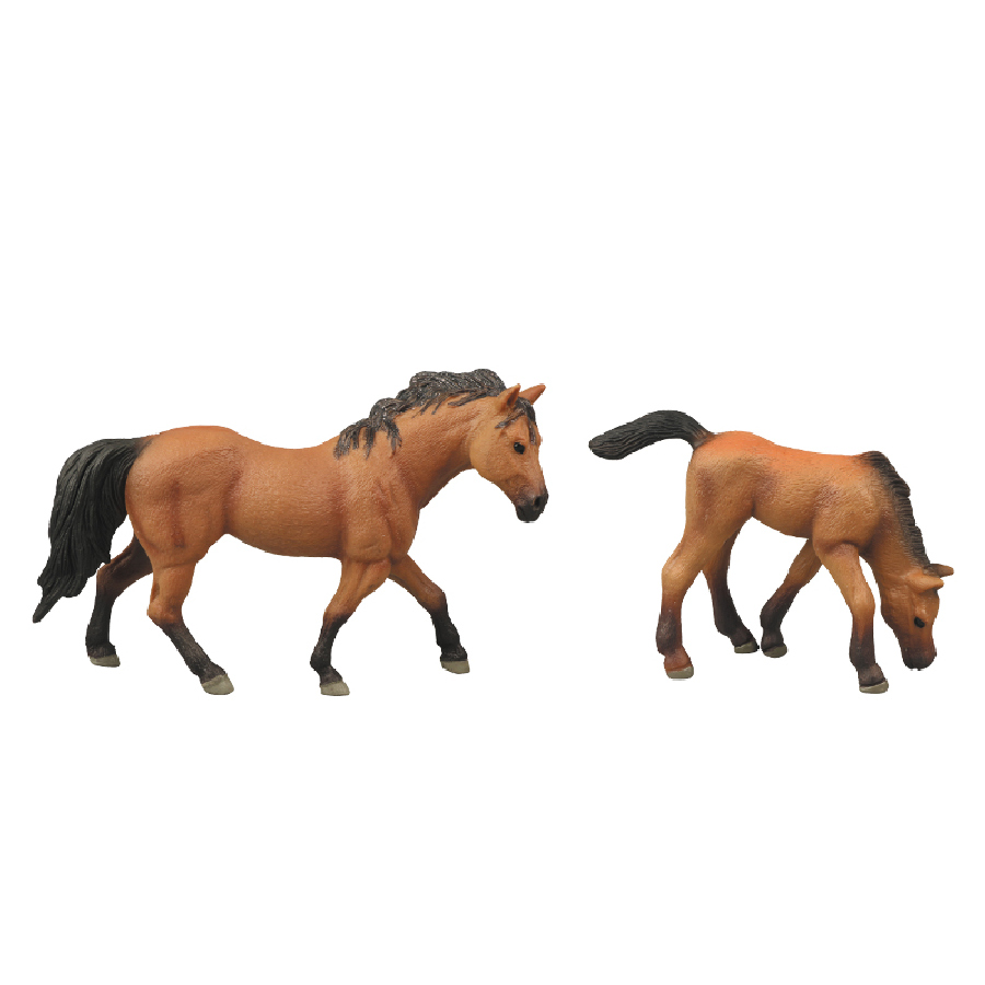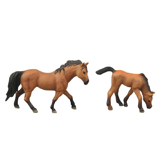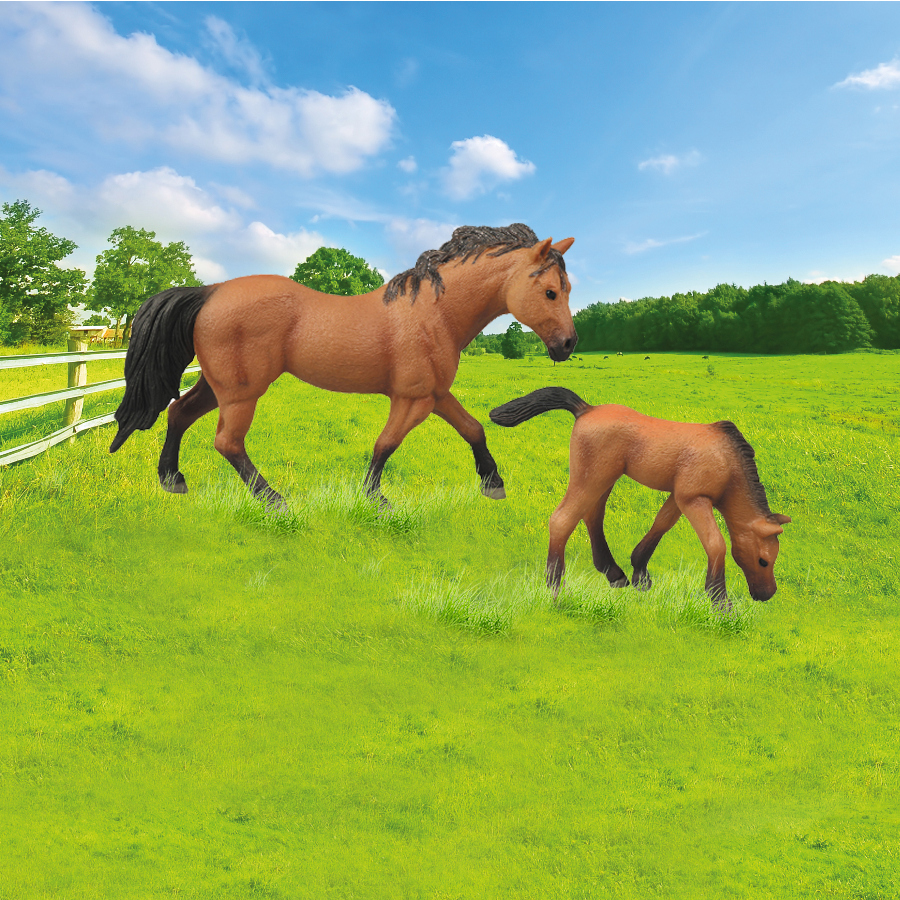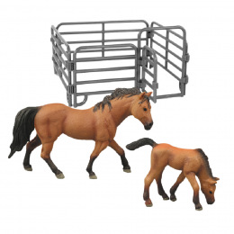 Figurka koně a hříběte v hnědé barvě. Součástí balení také ohrada. Ideální pro milovníky koní. Tato hračka je součástí kolekce Moje malá farma.