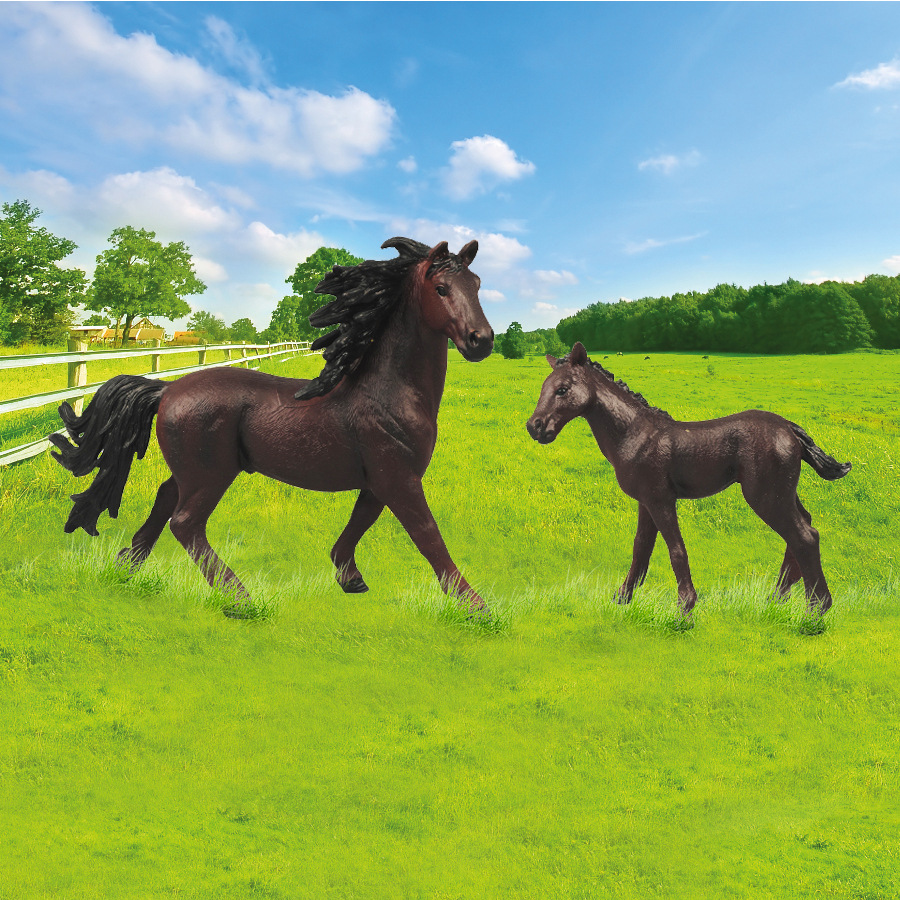 Figurka koně a hříběte v tmavě hnědé barvě s černou hřívou. Součástí balení také ohrada. Ideální pro milovníky koní. Tato hračka je součástí kolekce Moje malá farma.