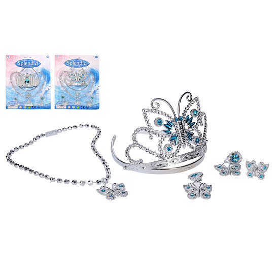 Princezna set. 2 varianty - korunky, motýli. Obsah balení - korunka, náhrdelník, prsten, 2x náušnice.