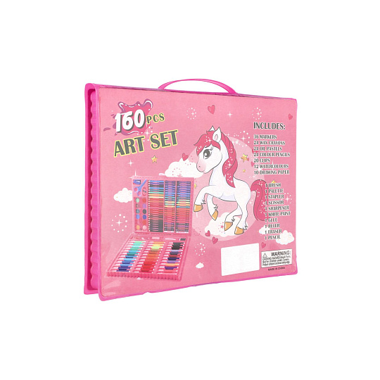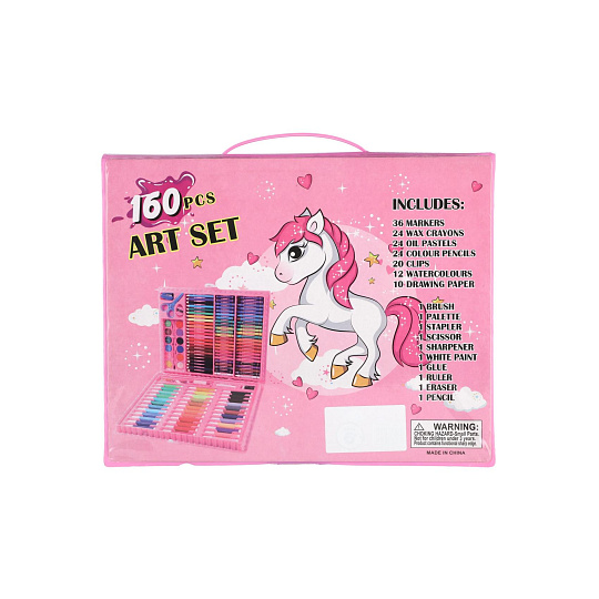 Vstupte do světa barev a fantazie! Tato kreativní sada s motivem jednorožce je splněným snem každého malého umělce. V praktickém plastovém kufříku najdete 160 výtvarných pomůcek – pastelky, fixy, voskovky, vodovky a další potřeby, které rozzáří každý obrázek. Rozměr kufříku: 34 × 27 × 3,5 cm Vhodné pro děti od 14 let