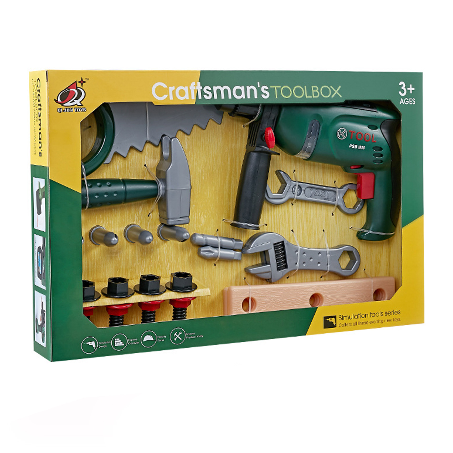 Dětské nářadí s aku vrtačkou a dalším příslušenstvím. Tato sada obsahuje vše potřebné pro malé kutily. Kromě aku vrtačky, která funguje na baterie (2 x 1,5V AA baterie, nejsou součástí balení), zde najdeš třeba kladívko, ruční pilu, klíče a další doplňky.