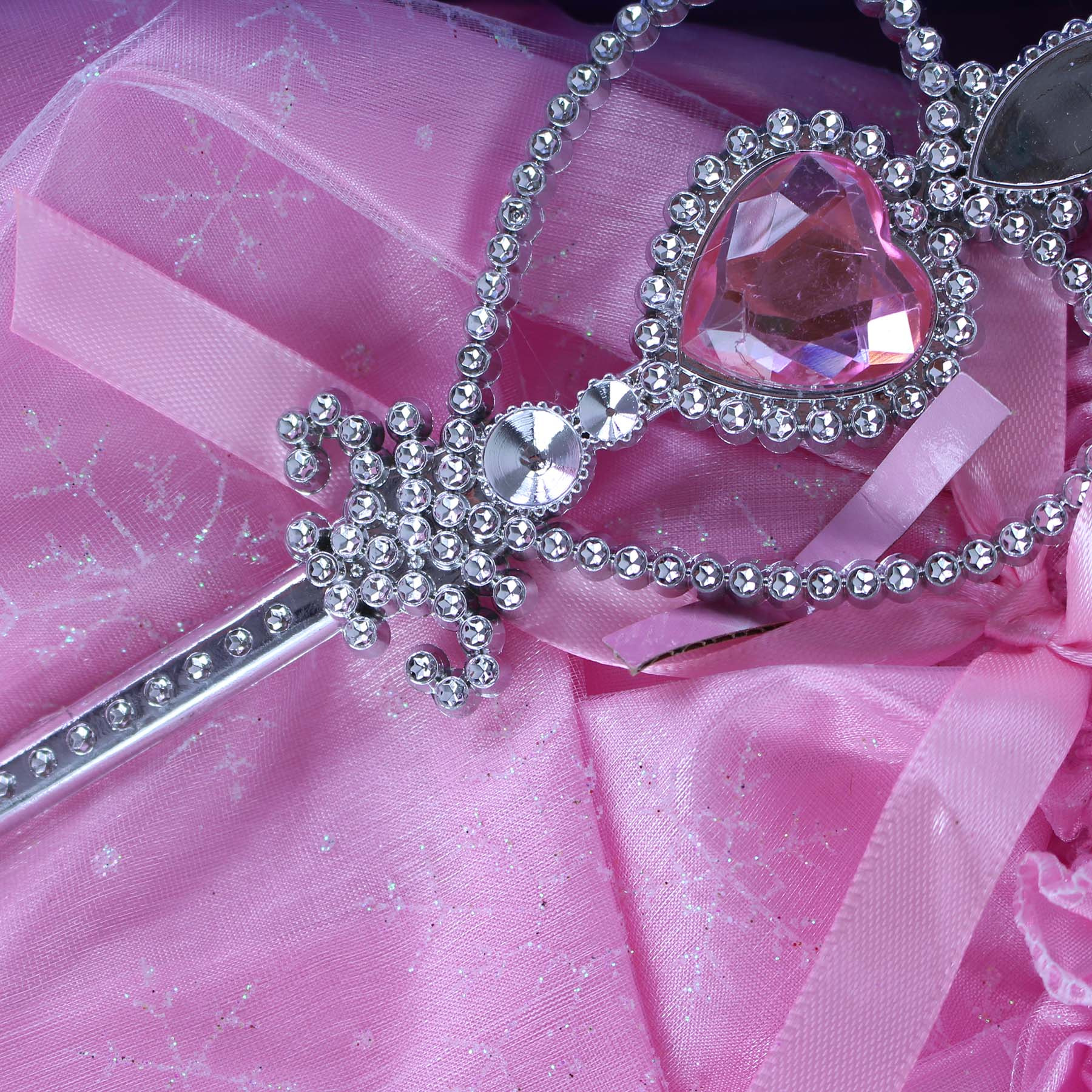 Exkluzivní sada pro princezny! Tato stylová souprava obsahuje sukničku, střevíčky, korunku, žezlo, náušnice, prsten, náhrdelník a kabelku. Vše je krásně sladěno a zdobeno krásnými ozdobnými kamínky růžové barvy. Obohať svůj kostým princezny o tyto nádherné doplňky!