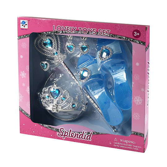 Proměň se v opravdovou princeznu! Tato krásná sada obsahuje vše, co malá parádnice potřebuje ke svým pohádkovým dobrodružstvím. Elegantní střevíčky, korunku, náušnice, prstýnek a kouzelnou hůlku. Díky stříbrno-modré barevné kombinaci působí celý set velmi slavnostně a okouzlujícím dojmem. Hodí se nejen na hraní doma, ale i na karnevaly, narozeninové oslavy či dětské párty.