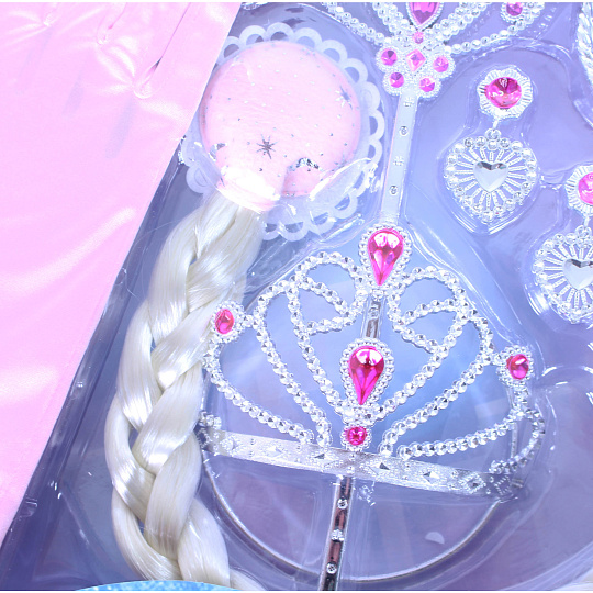 Exkluzivní sada pro všechny malé princezny! Krásná korunka s náušnicemi, prstýnky, hůlkou, náramky a rukavicemi. Doplňky jsou zdobeny růžovými prvky. Součástí je dlouhý cop v blond provedení. Perfektní sada ke kostýmu! Doporučeno pro děvčata od 3 let.