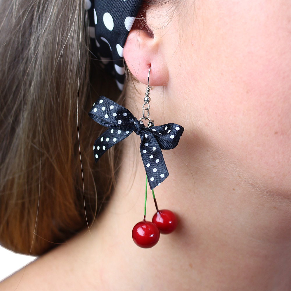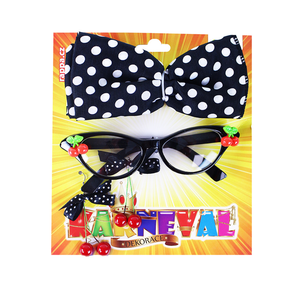 Sada třešňová obsahuje černé brýle, které jsou zdobeny malými třešničkami, třešňové náušnice s puntíkovanou černou stužkou a puntíkovaný šátek. Parádní doplňky na párty!