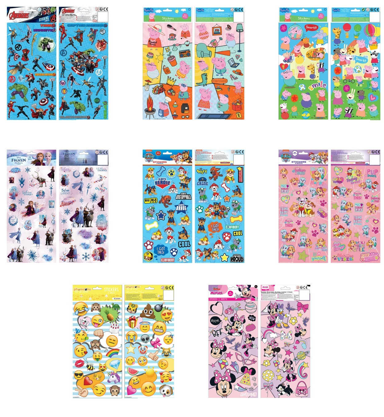 Samolepky 2 listy 15,5x35,5 cm 8 druhů (Avengers, Peppa Pig, Frozen 2, Paw Patrol, Emojis, Minnie). Nelze zvolit druh, dodáváme dle skladové dostupnosti.