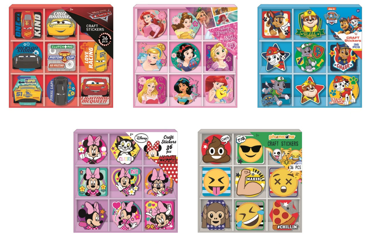 Samolepky v krabičce 36 kusů 10,5x10,5x1,5 cm 5 druhů (The Cars, Princezny, Paw Patrol, Minnie a Emojis). Nelze zvolit druh, dodáváme dle skladové dostupnosti.