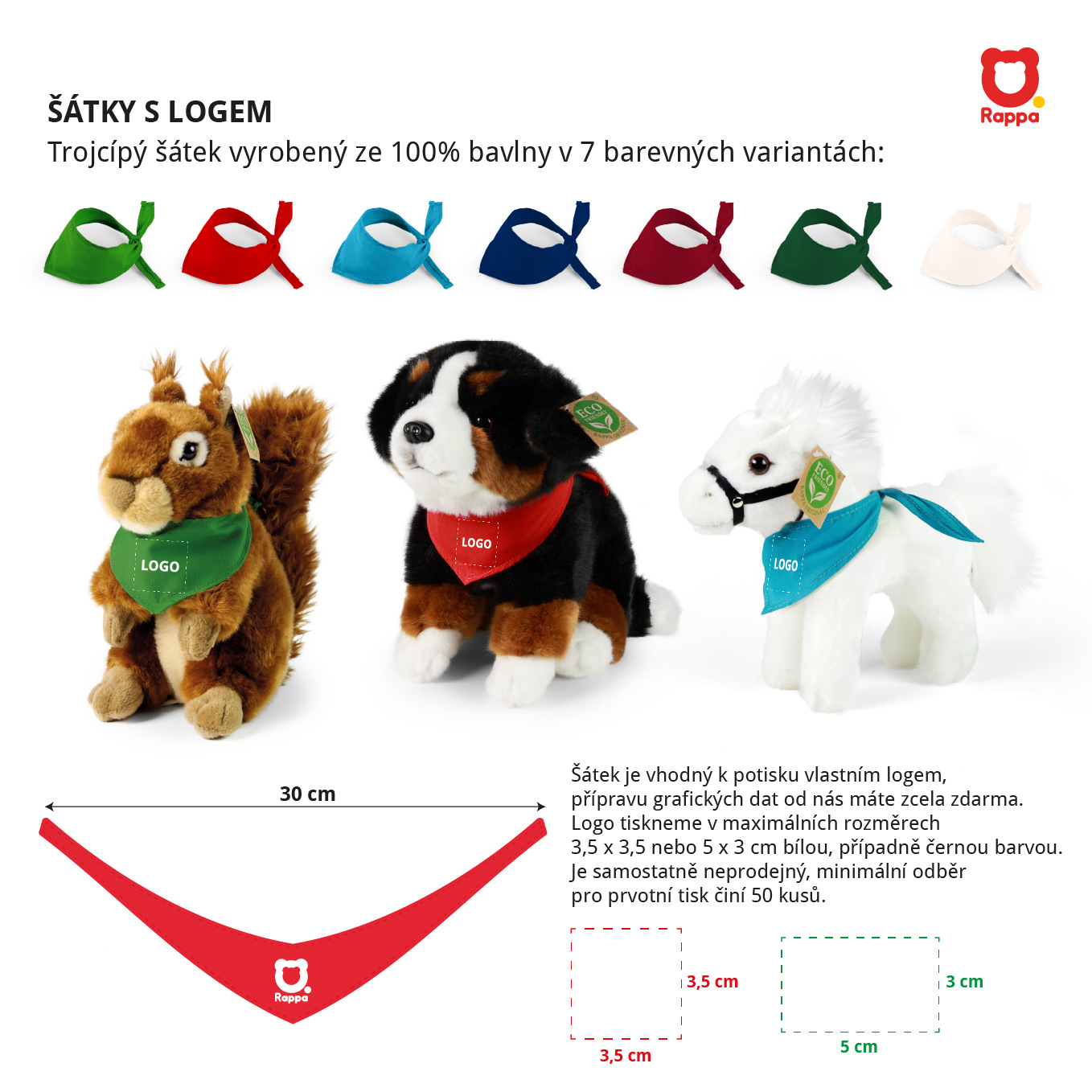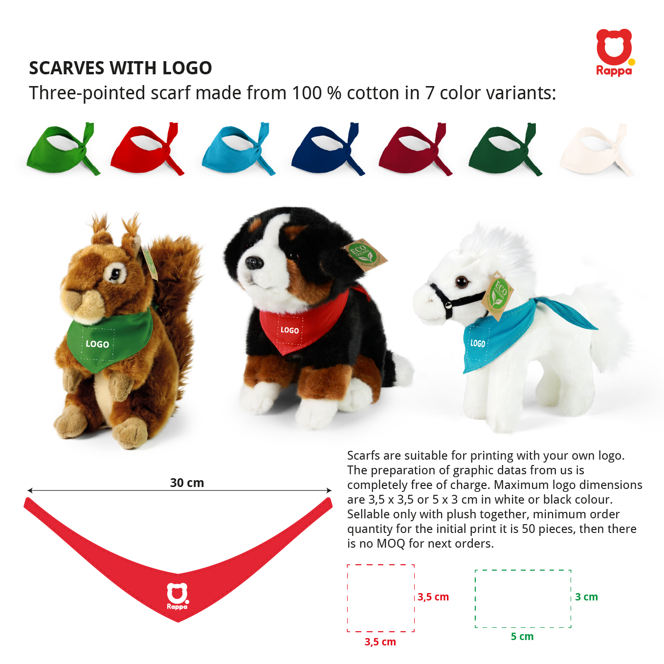 Šátek vhodný k potisku vlastním logem zcela zdarma. Je samostatně neprodejný, pouze velkoobchodně k vybranným plyšovým hračkám (do 30 cm). Pro více informací kontaktujte obchodní oddělení obchod@rappa.cz