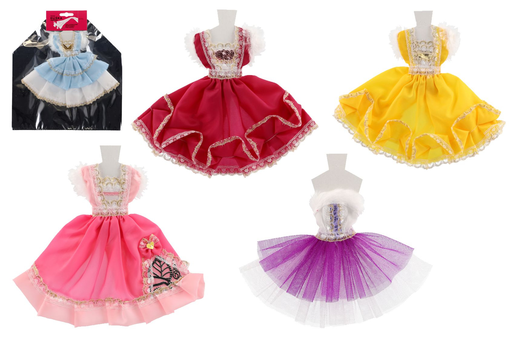 Šaty/Oblečky krátké na panenky mix druhů v sáčku 22x30cm