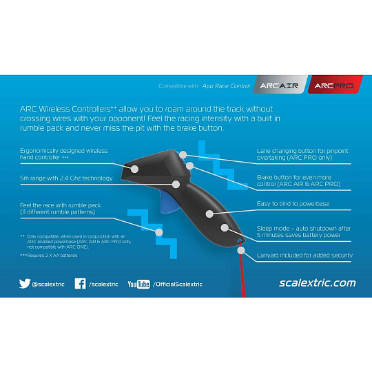 S bezdrátovými ovladači ARC se můžete pohybovat po trati, aniž byste si překřížili kabely se soupeřem. Vnímejte intenzitu závodu s integrovaným vibračním modulem a díky tlačítku brzdy již nikdy nepřejedete box. Ergonomicky navržený bezdrátový ruční ovladač. Dosah 5 metrů díky 2,4Ghz technologii. Vnímejte závod díky vibračnímu modulu (11 různých stylů vibrací). Tlačítko pro změnu dráhy při předjíždění (pouze ARC PRO). Tlačítko brzdy pro ještě větší kontrolu (ARC AIR a ARC PRO). Snadné připojení k napájecí základně. Režim spánku – automatické vypnutí po 5 minutách šetří baterii. Lanko pro větší zabezpečení. Kompatibilní pouze při použití s napájecí základnou s podporou ARC (pouze ARC AIR a ARC Pro, není kompatibilní s ARC ONE).