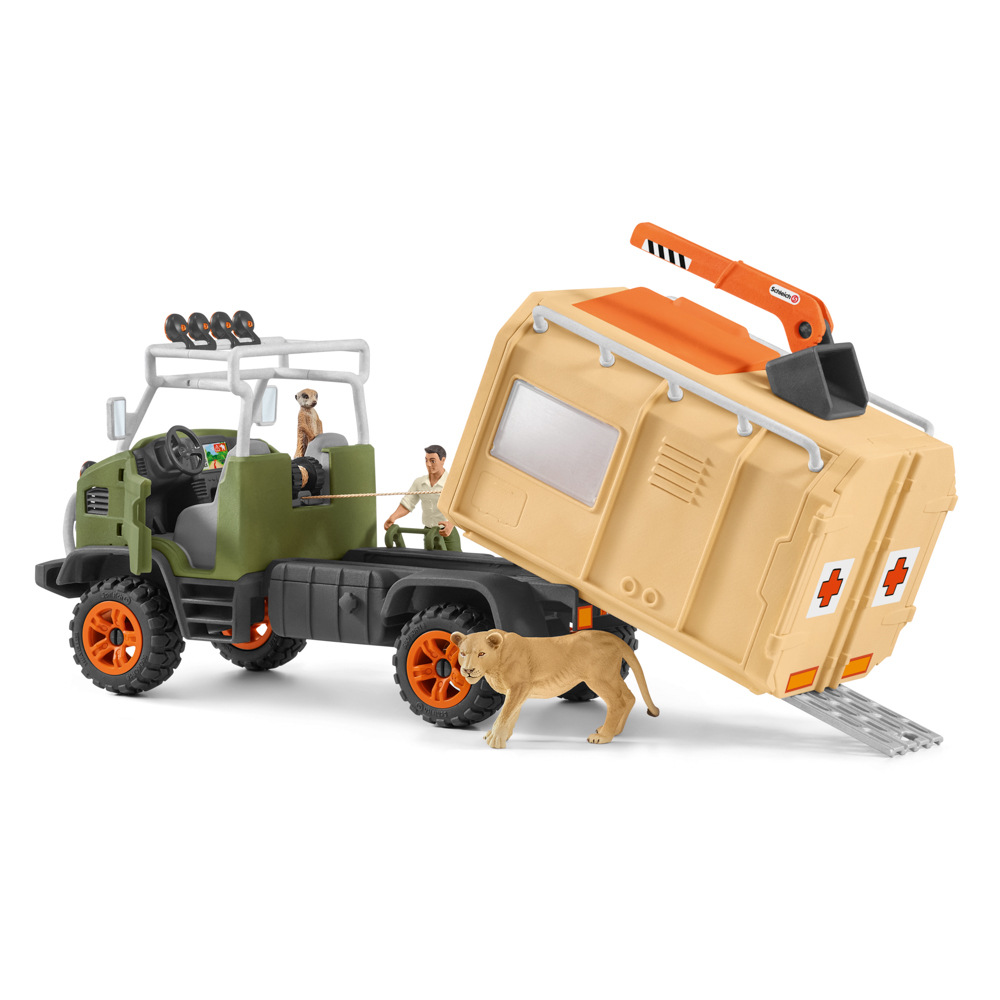 Ranger Tom a jeho kamarád permoník Ted jsou v záchranném voze ze Schleich® Wild Life na své první společné misi. Na Safari najdou Tom a Ted lvici, která musí být urgentně ošetřena v autě.